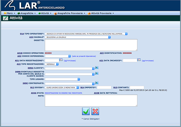 Arixs è il software gestionale che consente di istituire il registro unico per l'antiriciclaggio, Facile da usare dispone di un'apposita gestione provvisoria senza il timore di errori e modifiche. E' anche l'unico con un video corso da seguire online. Adatto a Consulenti del lavoro e commercialisti, avvocati,revisori contabili e società di revisione, Vendo e Compro oro, Agenzie Immobiliari,. Promotori finanziari, Intermediari assicurativi....